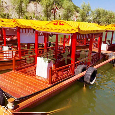 畫舫船就是裝飾古典華麗的游船,是"中國風"的仿古游船,結合古典園林建筑,體現了中華文明的古典藝術.畫舫船豪華而又古典,船上的建筑按照中國古代建筑里的亭臺樓閣,建筑工藝之復雜,要求之嚴格,仿古畫舫游船的特點飛檐翹角、玲瓏精致的四角亭子逐漸成形,赫然立于船頭,美人靠、盤龍柱子、彩畫……龍柱上的浮雕盤龍和祥云一層扣著一層,層層錯落有致,雕刻精細到盤龍身上的每一個鱗片都細細可數,古代皇家標志性元素,在畫舫船上體現的淋漓盡致。除了雕刻、花窗,整條船還有一個看點,那就是弧線優美、高高翹起的船尾。游船并不大,長約10米、寬3米,但是整體看起來堪稱一件藝術品。船尾的雕花欄桿與船艙、船頭的雕刻遙相呼應,船身四周貼著浮雕祥云,給整條船增添了富貴、華麗的氣質。